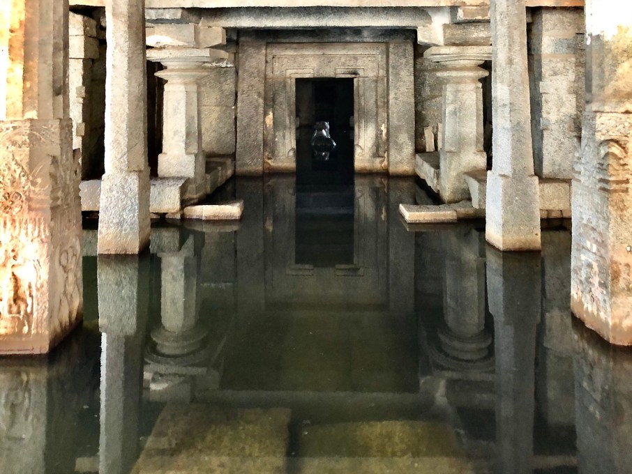 The whole temple is located a few meters below the ground in such a way that the oof of the temple is at current ground level. One has to walk almost 20 meters through 2 feet water to reach to the room with Lord Shiva statue. Local legends say the water is channelled straight from the Tunghabhadra river.