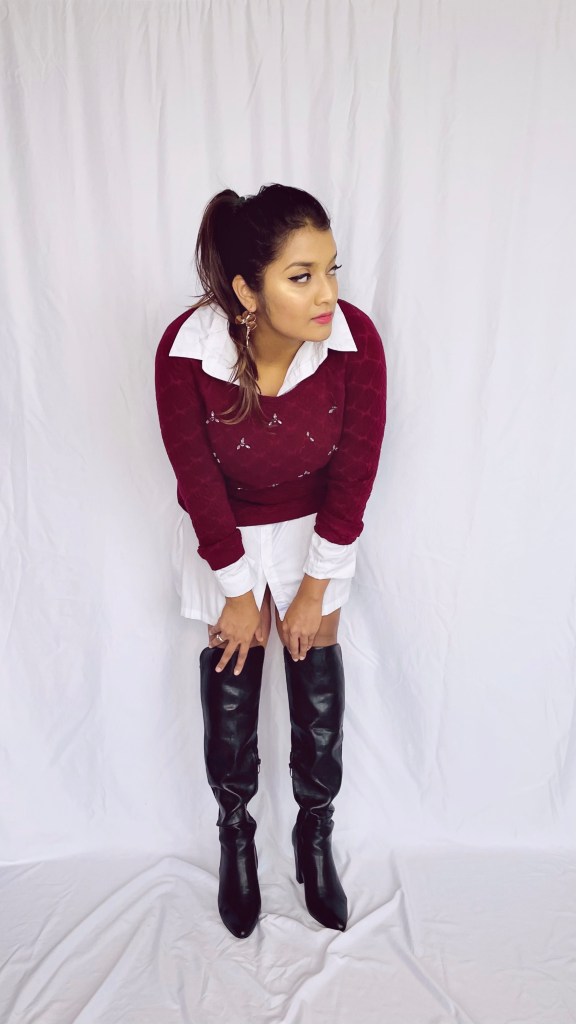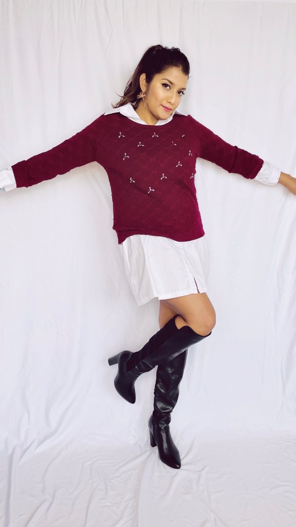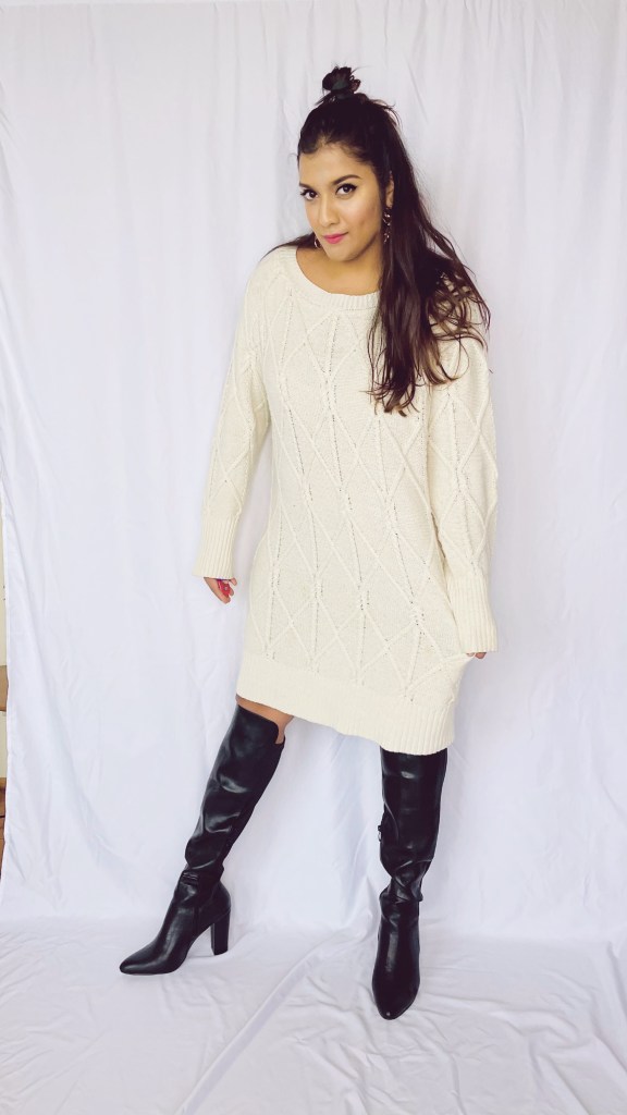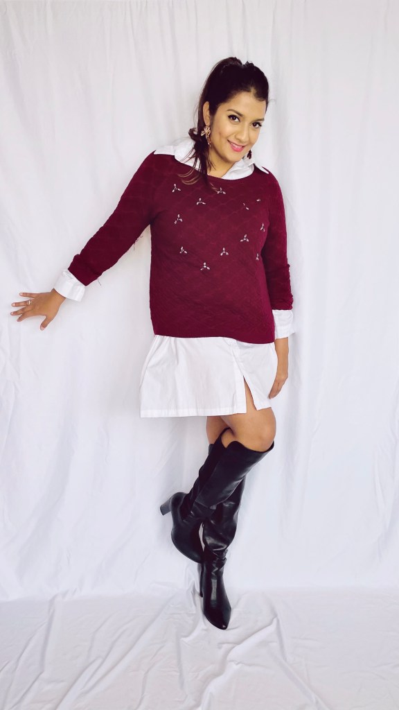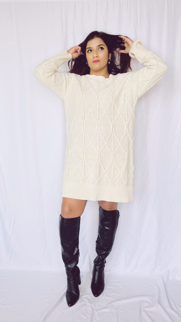 Last, but not the least and maybe one of my favorites, it’s stylish, and it takes only a minute to try. The best investment for this look is a white shirt dress and is a great example of turning a summer outfit into a winter one. I have chosen an embellished sweater for this look, but once you have a white dress, the options are endless!