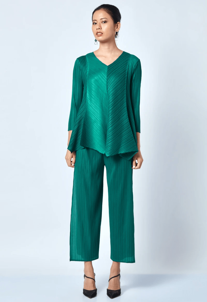 Pleated clothes are the new beautiful! Love this co-ordinate set from Scarlet Sage in the shade of Emerald Green, that will have all eyes on you. I would wear this lovely set for a romantic dinner with some subtle diamond earrings!