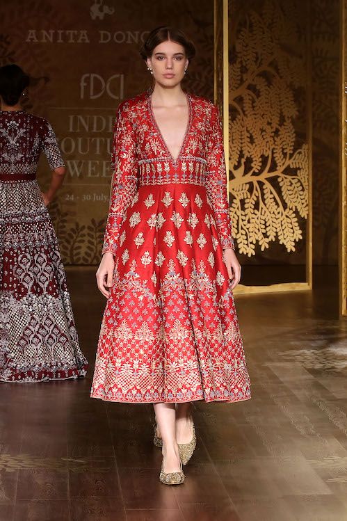 Red is a perfect wedding color choice, and especially when it has such great cuts and a feminine silhouette. This dress is for the women who aren’t scared to experiment with bold cuts and a deep neck. The embroidery and finish of this dress is a one to make you look slim for your next wedding!
