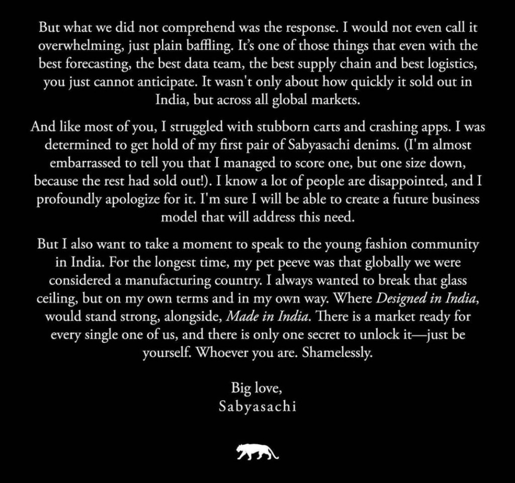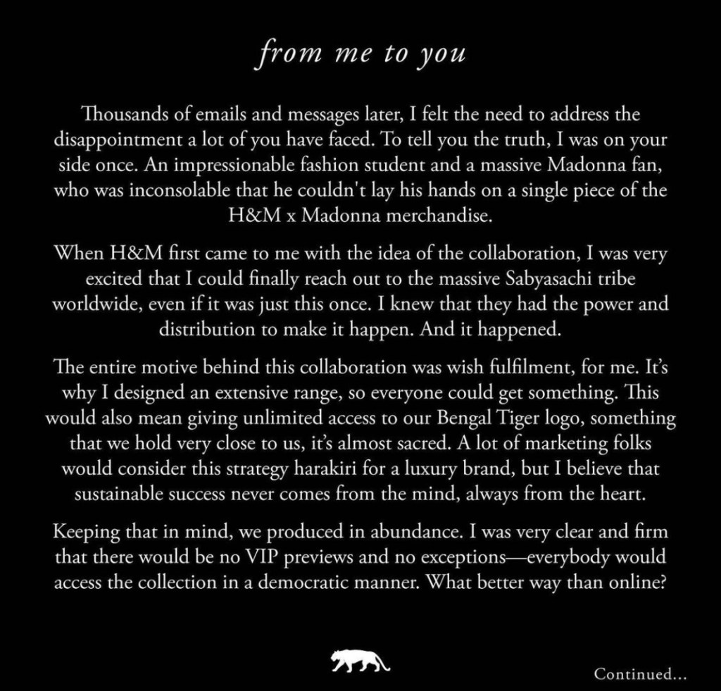 I want to focus on a few interesting things in this message, where Sabyasachi’s statement says there were no VIP previews and no exceptions. Well, when customers see 100’s of influencers wearing the clothes they want to buy, and celebrities stepping out in the latest collection it does not match this statement even closely. We saw Alia Bhatt, an Indian actress wearing a kaftan top from their latest collection and I felt like it did not seem fair to make a statement of that sort. Also, not such a fan of the Madonna comment either. Does it really give the end consumer a sense of how this was carried out without any hierarchy?