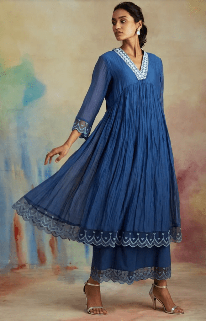 For those who don’t want a super fashion forward look, here’s a classic blue loose fitting anarkali, similar to the angrakha style of salwars to give you that breezy look!