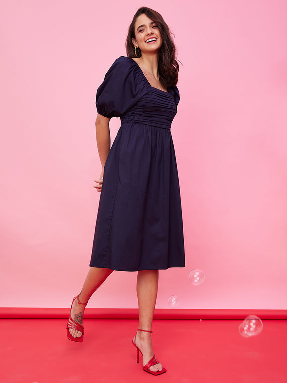 Another beautiful dress you need to have in your closet is this dark blue puffy sleeve dress that I can’t stop admiring!