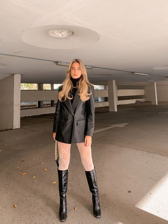 If you are in the mood to wear some high boots, this is a great way to wear a blazer and boots in all black attire.