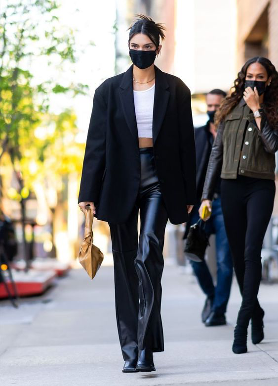 Kendall Jenner, spotted wearing these really gorgeous leather pants, and an oversized black blazer. I even like the black mask to go along with it.
