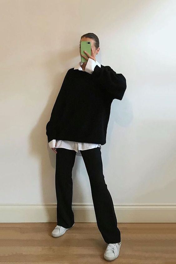 This is a simple way to put together a black sweater and some wide leg pants, and pairing it with some white sneakers. It is something that we all own in our closets.