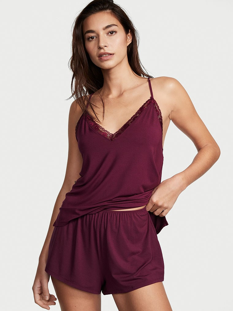 - Natori Feathers Satin Pajama Set: This pajama set features a soft, satin material with delicate lace trim and Natori’s signature Feathers print. The set includes a camisole top and matching shorts, and is perfect for warm weather.